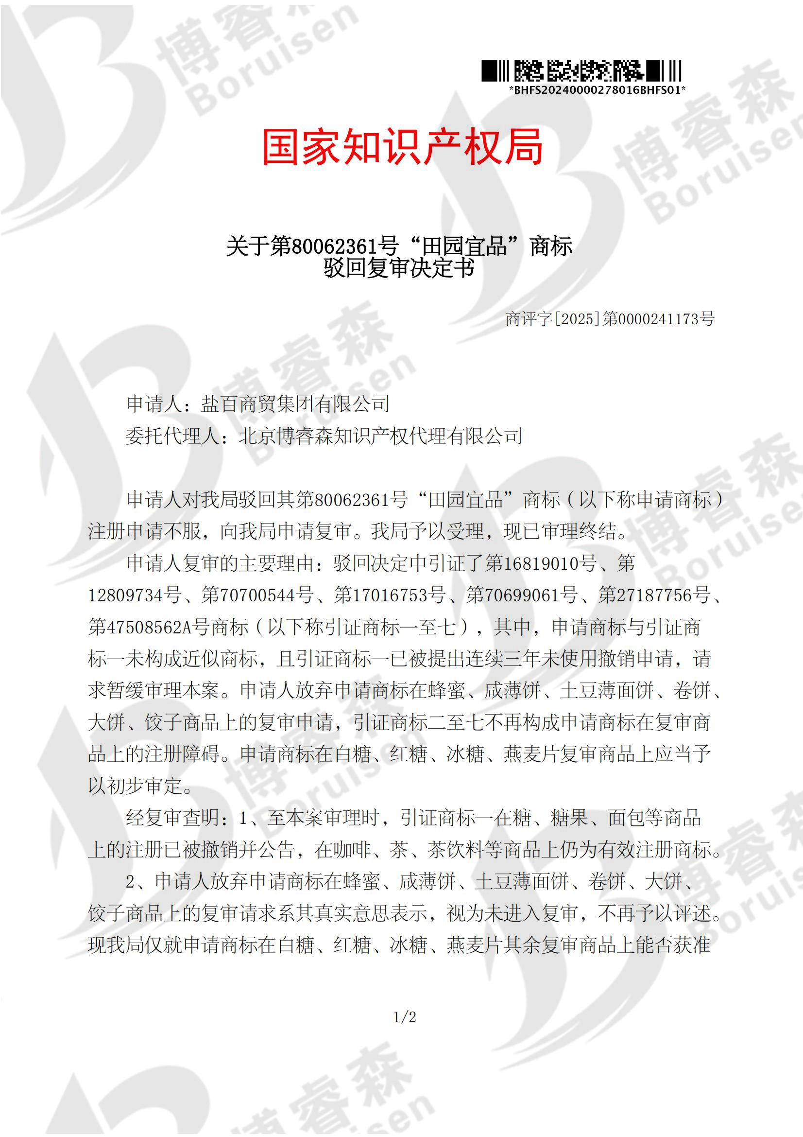 盐百商贸集团有限公司对其注册在30类的80062361号商标被商标局驳回不服,根据《中华人民共和国商标法》第三十四条之规定,特委托我公司代理该商标的驳回复审维权事宜,并最终取得维权成功。