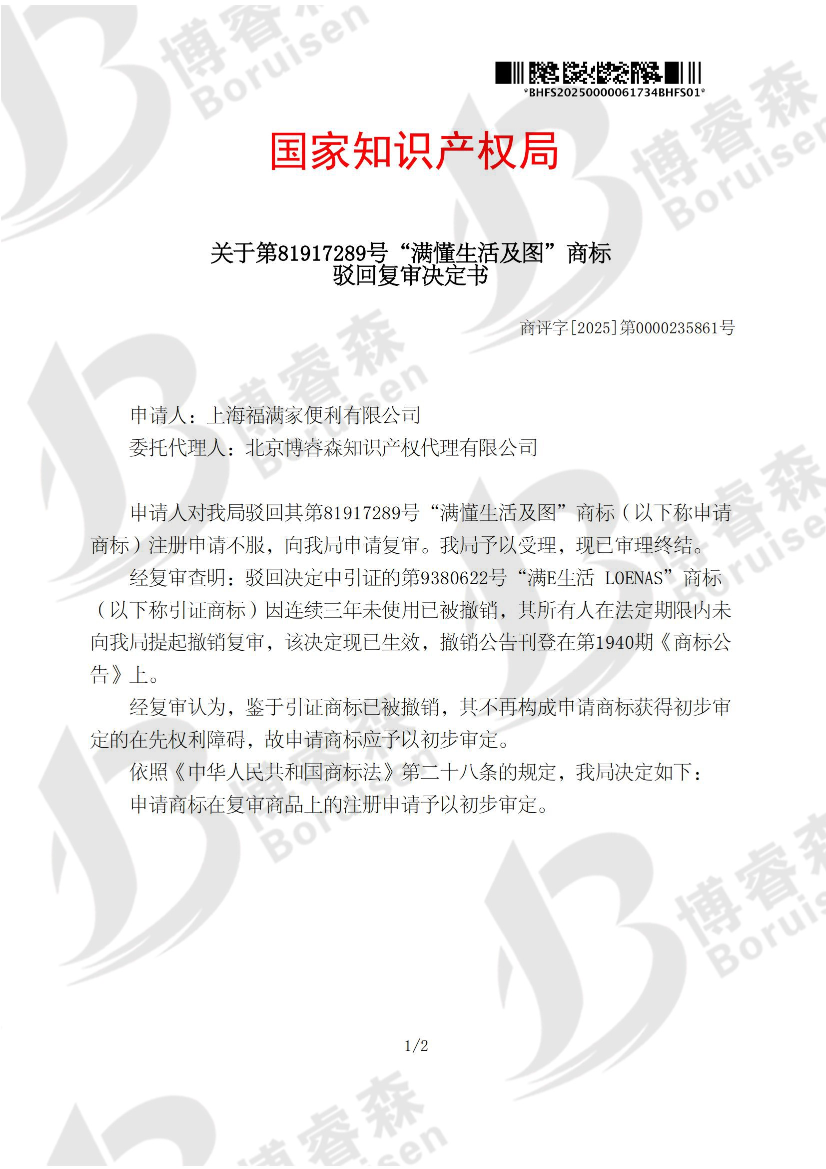 上海福满家便利有限公司对其注册在21类的81917289号商标被商标局驳回不服,根据《中华人民共和国商标法》第三十四条之规定,特委托我公司代理该商标的驳回复审维权事宜,并最终取得维权成功。