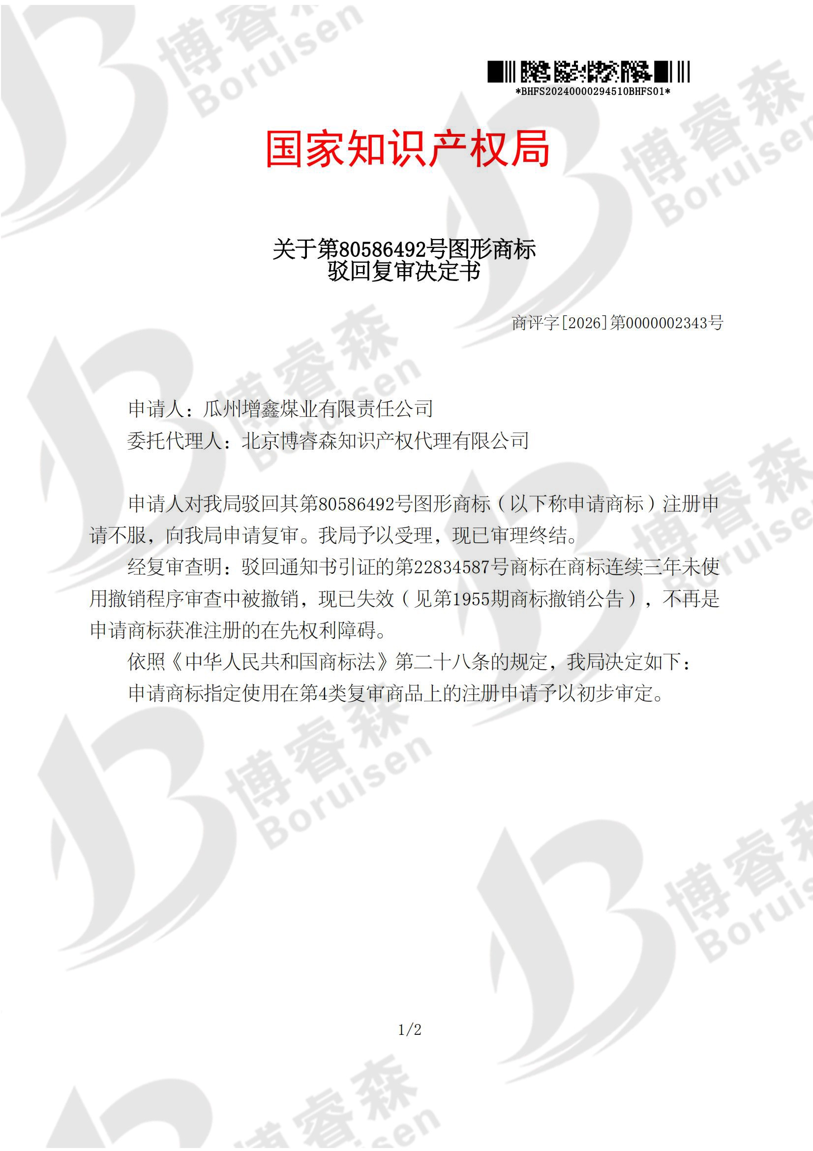 瓜州增鑫煤业有限责任公司对其注册在4类的80586492号商标被商标局驳回不服,根据《中华人民共和国商标法》第三十四条之规定,特委托我公司代理该商标的驳回复审维权事宜,并最终取得维权成功。