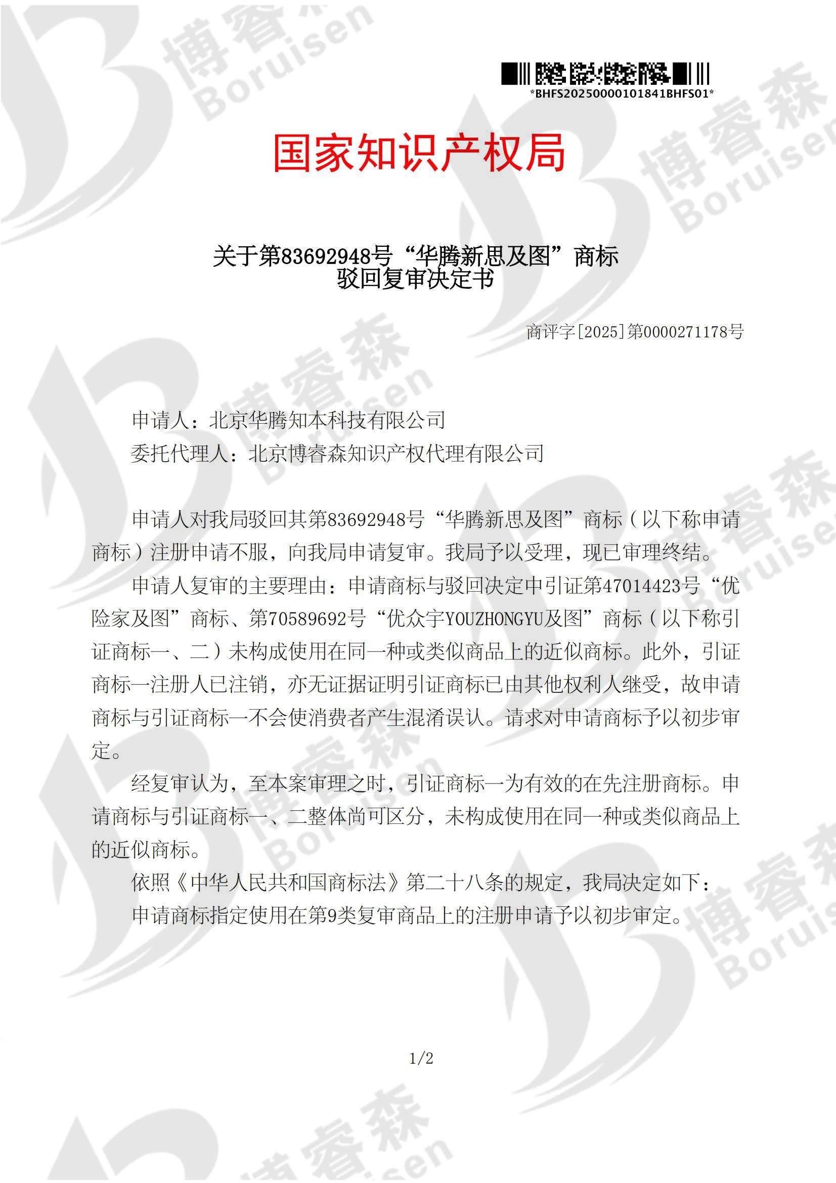 北京华腾知本科技有限公司对其注册在9类的83692948号商标被商标局驳回不服,根据《中华人民共和国商标法》第三十四条之规定,特委托我公司代理该商标的驳回复审维权事宜,并最终取得维权成功。