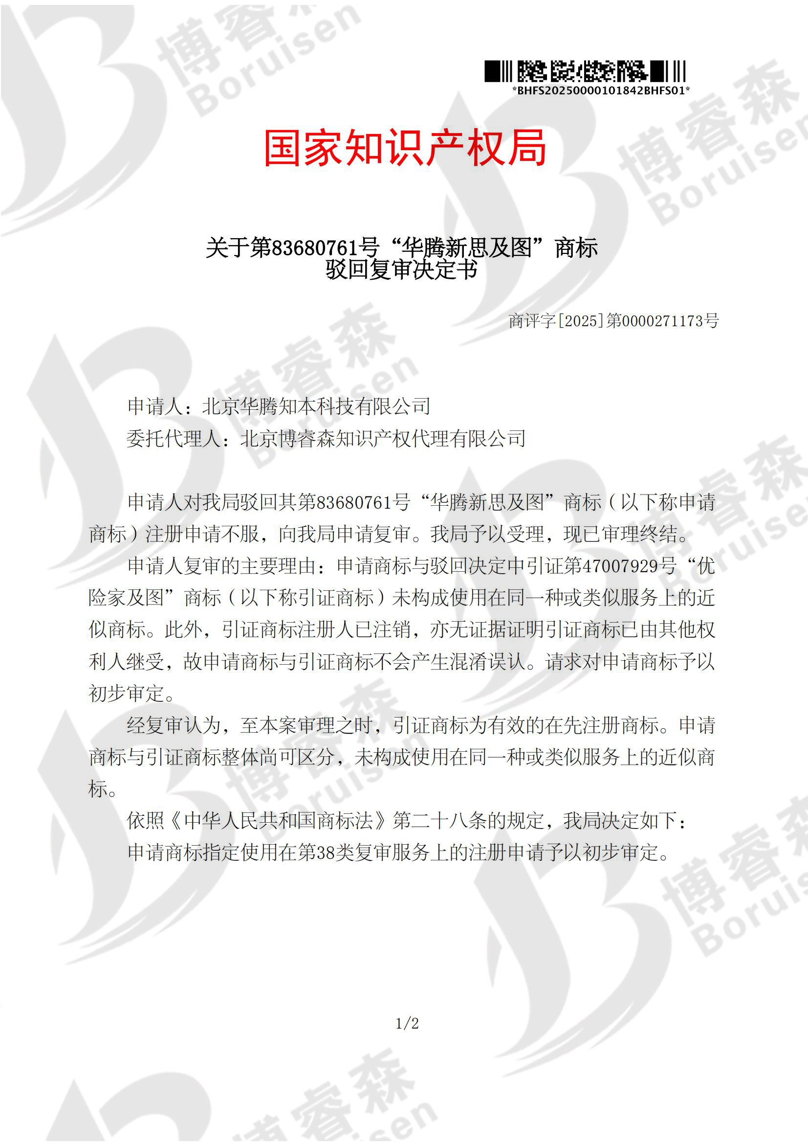 北京华腾知本科技有限公司对其注册在38类的83680761号商标被商标局驳回不服,根据《中华人民共和国商标法》第三十四条之规定,特委托我公司代理该商标的驳回复审维权事宜,并最终取得维权成功。