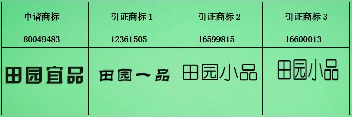 3、申请人已经在先拥有多个类别上“田园宜品”商标的专用权,本案商标作为在先主品牌商标的延续性注册,是基于市场变化以及经营策略的转化进行的申请注册,是基于企业发展规划深思熟虑的结果,故特恳请贵局准予申请商标获得核准注册。