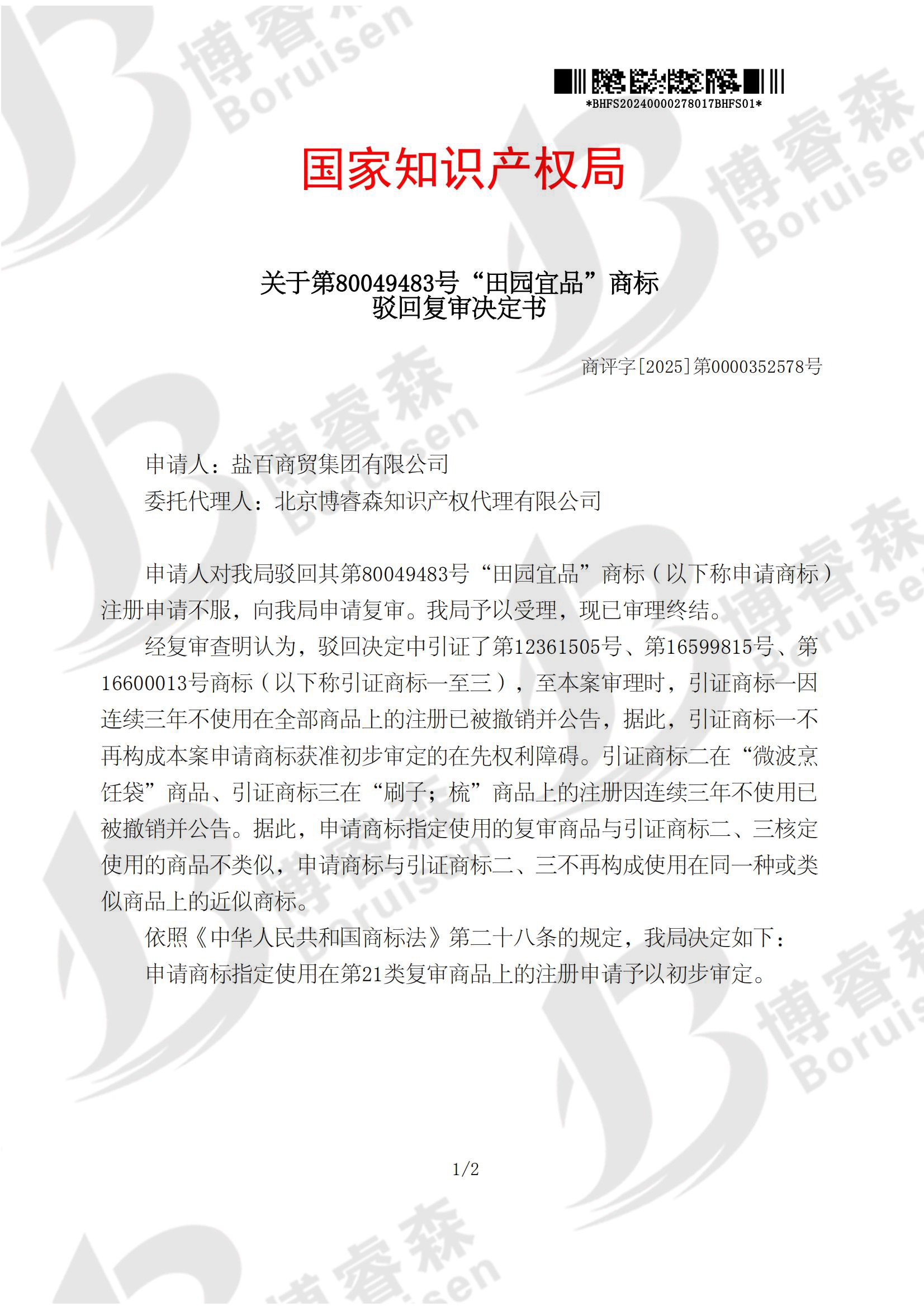 盐百商贸集团有限公司对其注册在21类的80049483号商标被商标局驳回不服,根据《中华人民共和国商标法》第三十四条之规定,特委托我公司代理该商标的驳回复审维权事宜,并最终取得维权成功。