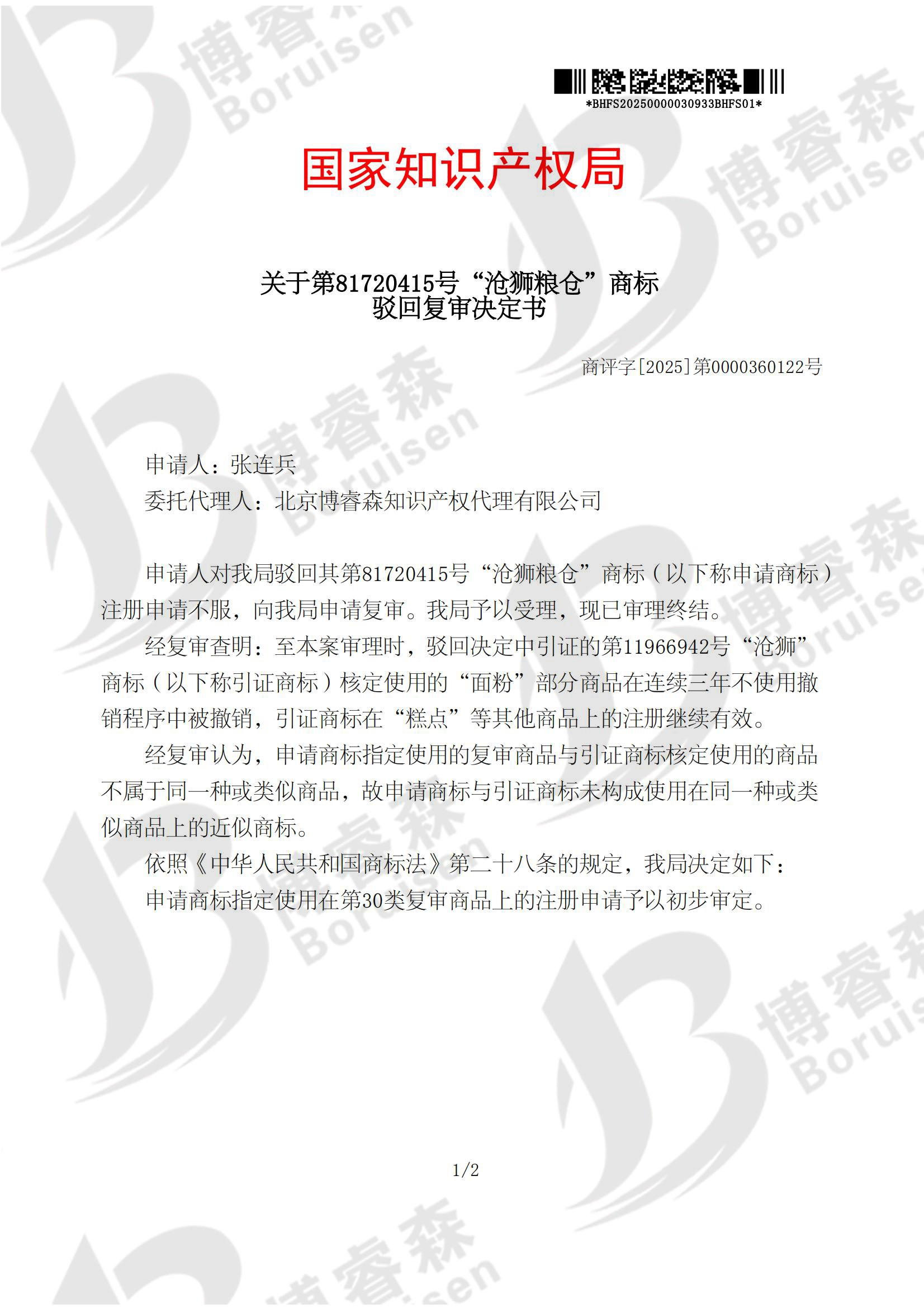 张连兵对其注册在30类的81720415号商标被商标局驳回不服,根据《中华人民共和国商标法》第三十四条之规定,特委托我公司代理该商标的驳回复审维权事宜,并最终取得维权成功。