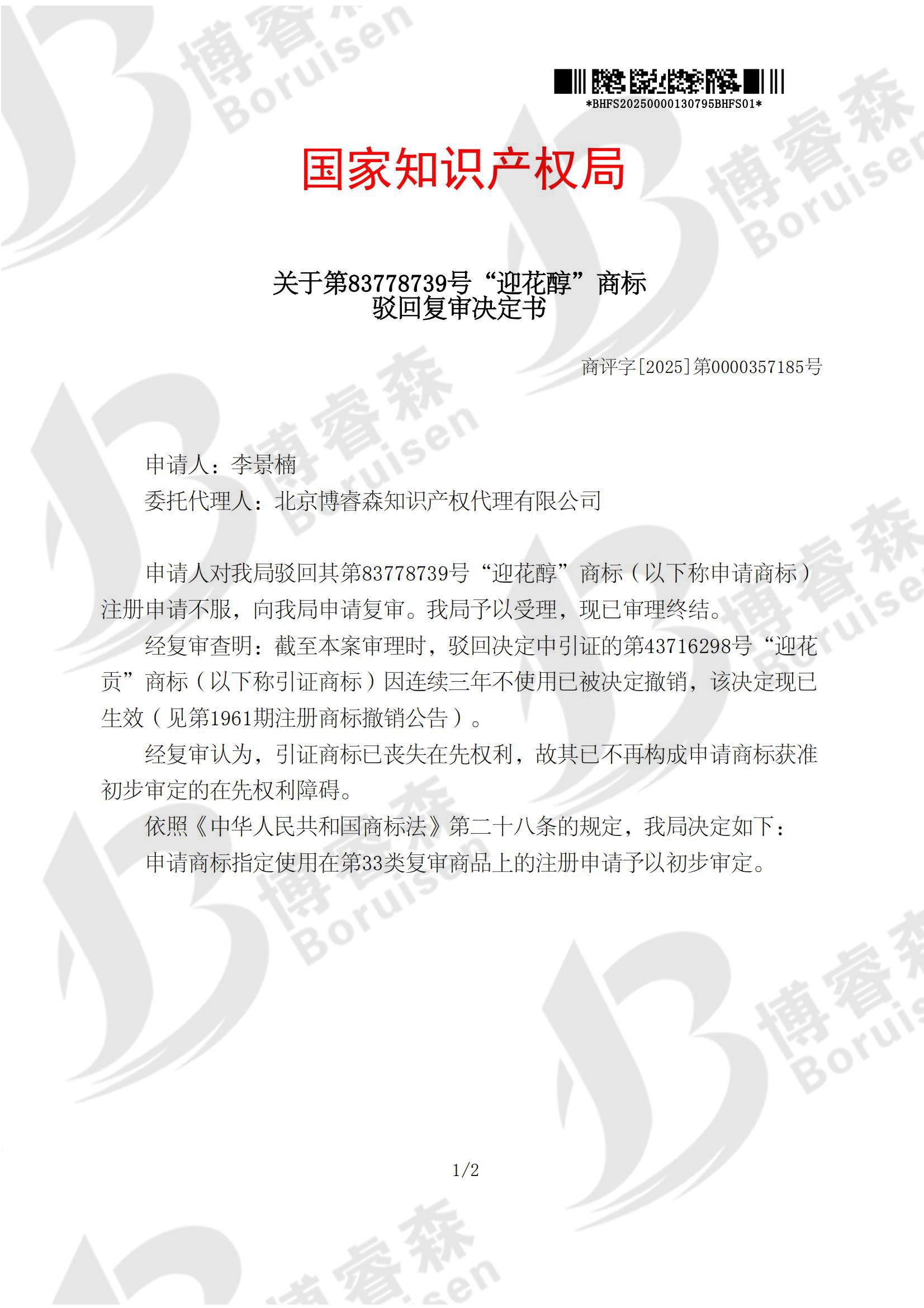 李景楠对其注册在33类的83778739号商标被商标局驳回不服,根据《中华人民共和国商标法》第三十四条之规定,特委托我公司代理该商标的驳回复审维权事宜,并最终取得维权成功。