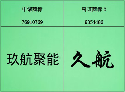 3、申请商标显著识别部分是汉字“玖航聚能”,而引证商标2显著识别部分是汉字“久航”。申请商标与引证商标2在商标构成、整体外观效果、显著性、呼叫、含义及公司经营属性上均存在巨大差异,根本不构成近似,更不会造成相关公众的混淆和误认,根据《商标法》的相关规定,申请商标理应作为商标获得核准注册。