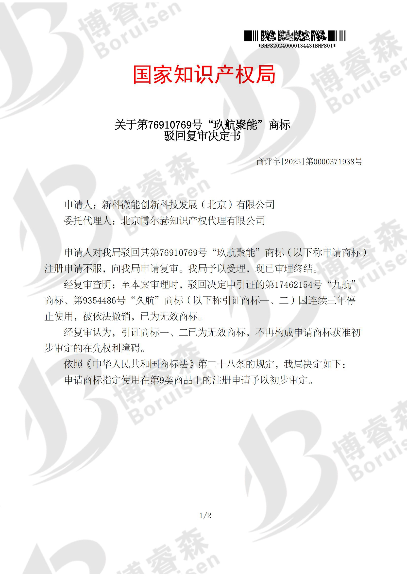新科微能创新科技发展(北京)有限公司对其注册在9类的76910769号商标被商标局驳回不服,根据《中华人民共和国商标法》第三十四条之规定,特委托我公司代理该商标的驳回复审维权事宜,并最终取得维权成功。